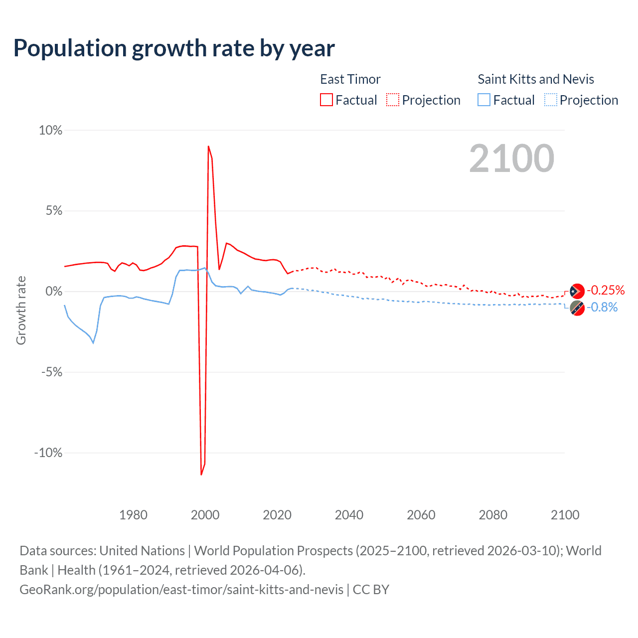 - For the last 10 years, East Timor has had an average growth rate of +1.74% per year vs -0.04% in Saint Kitts and Nevis.