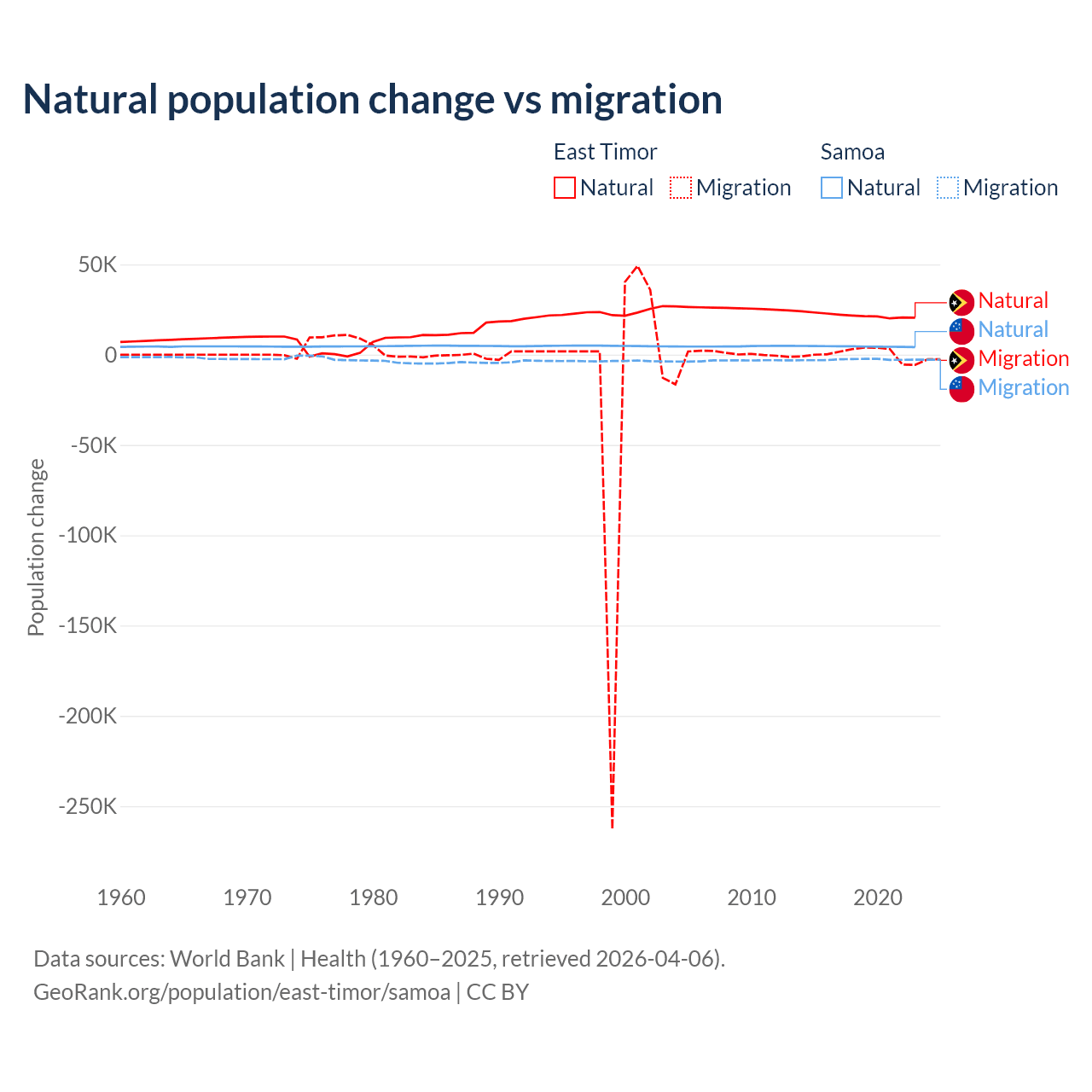 Over the last 10 years, 98.3% of the population change in East Timor is from natural causes (a gain of 217,698 people) and 1.66% is from migration (a gain of 3,665 people). In Samoa 62.5% is from natural causes (a gain of 45,436 people) and 37.5% is from migration (a loss of 27,246 people).