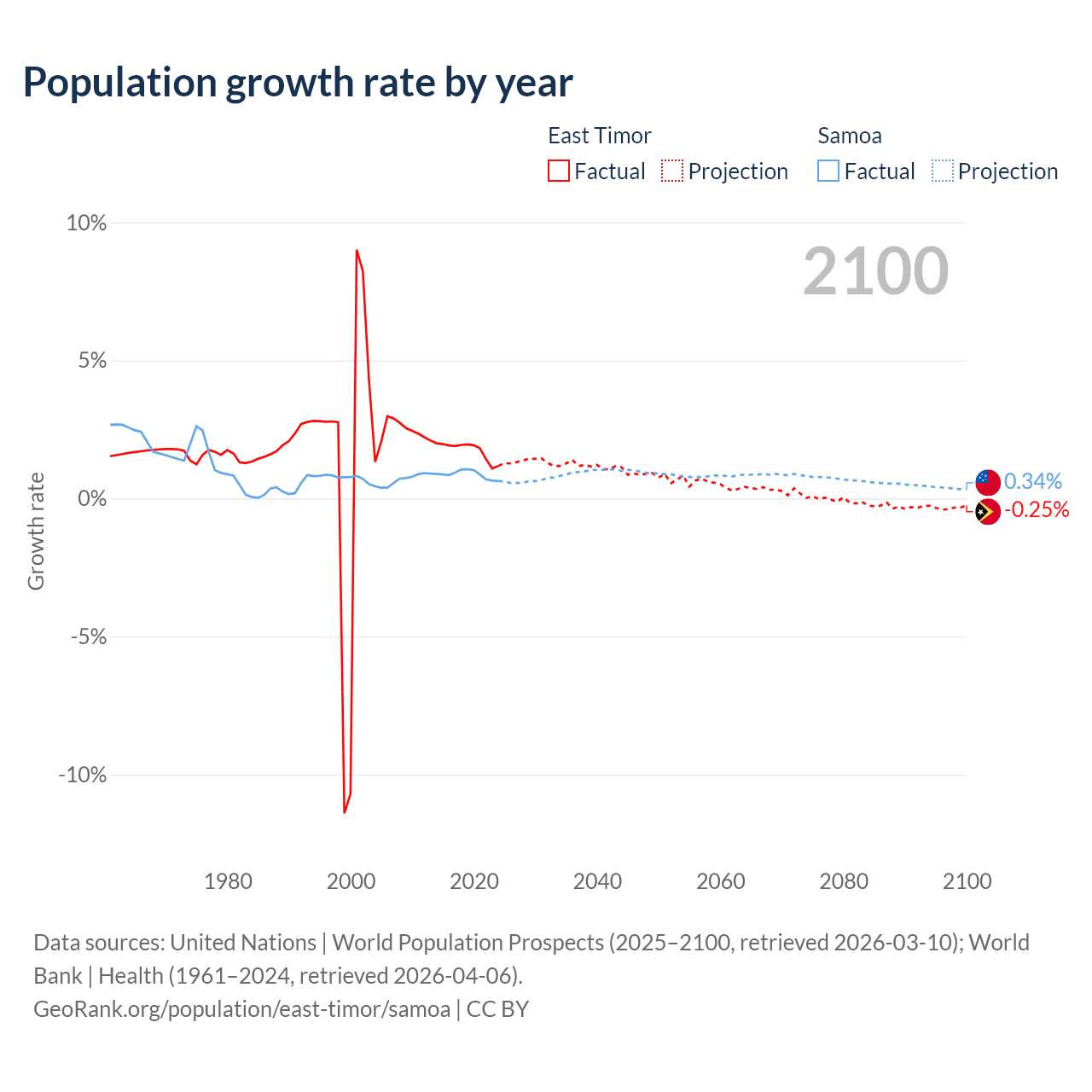 - For the last 10 years, East Timor has had an average growth rate of +1.74% per year vs +0.87% in Samoa.