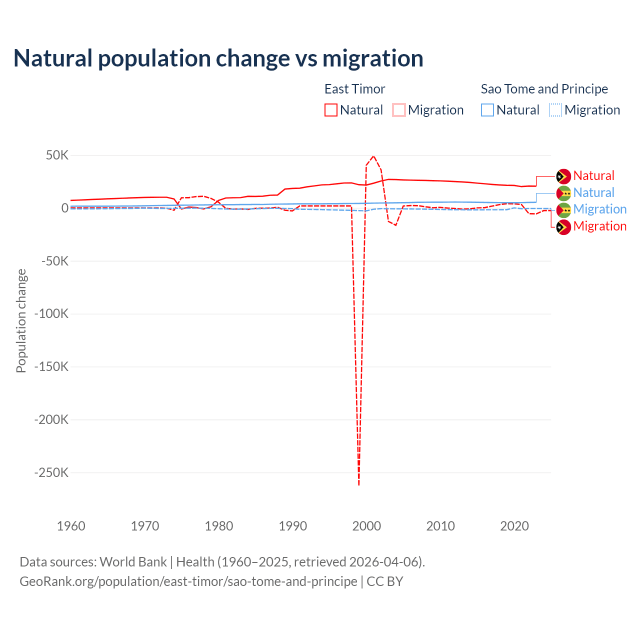Over the last 10 years, 98.3% of the population change in East Timor is from natural causes (a gain of 217,698 people) and 1.66% is from migration (a gain of 3,665 people). In Sao Tome and Principe 80.1% is from natural causes (a gain of 50,822 people) and 19.9% is from migration (a loss of 12,621 people).