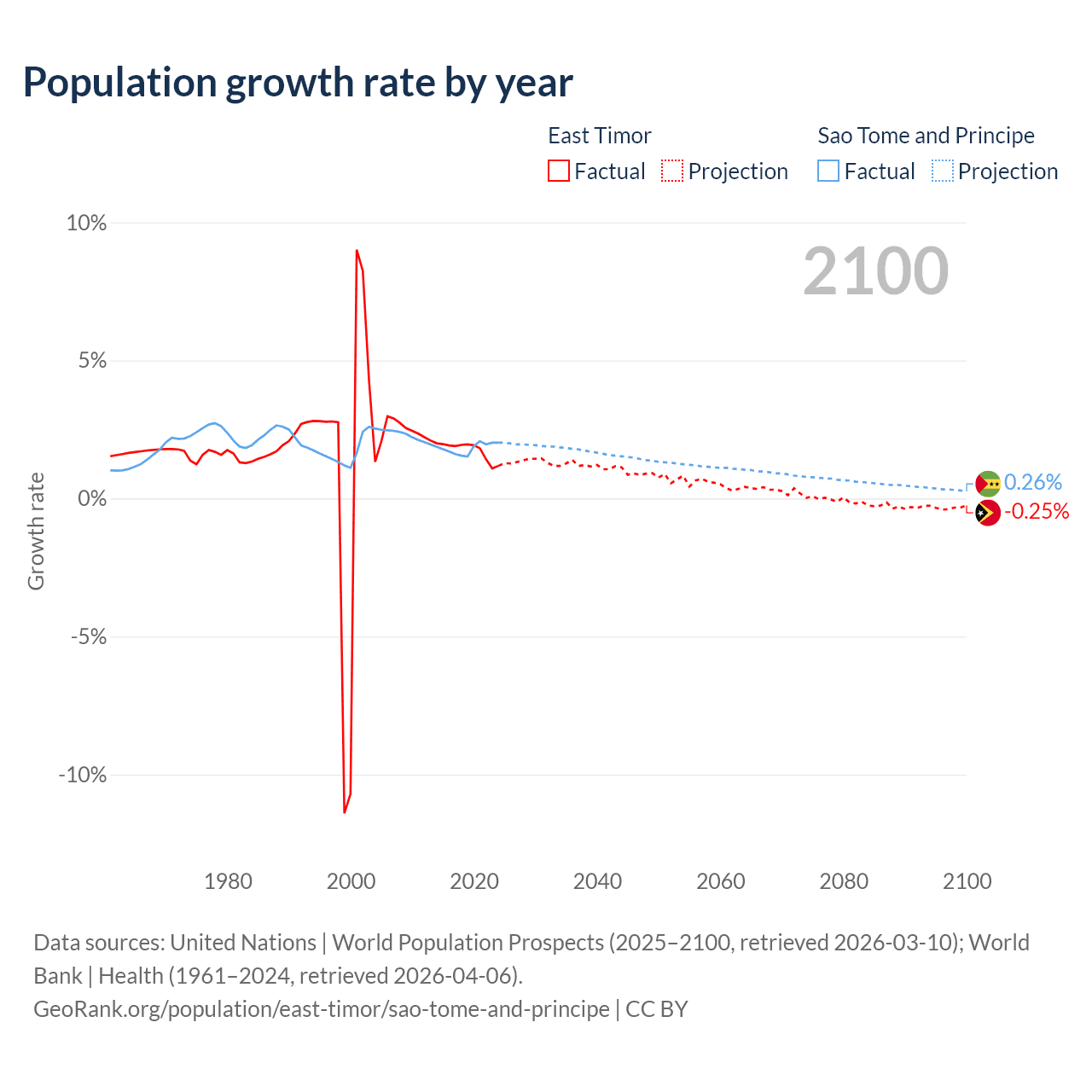 - For the last 10 years, East Timor has had an average growth rate of +1.74% per year vs +1.82% in Sao Tome and Principe.