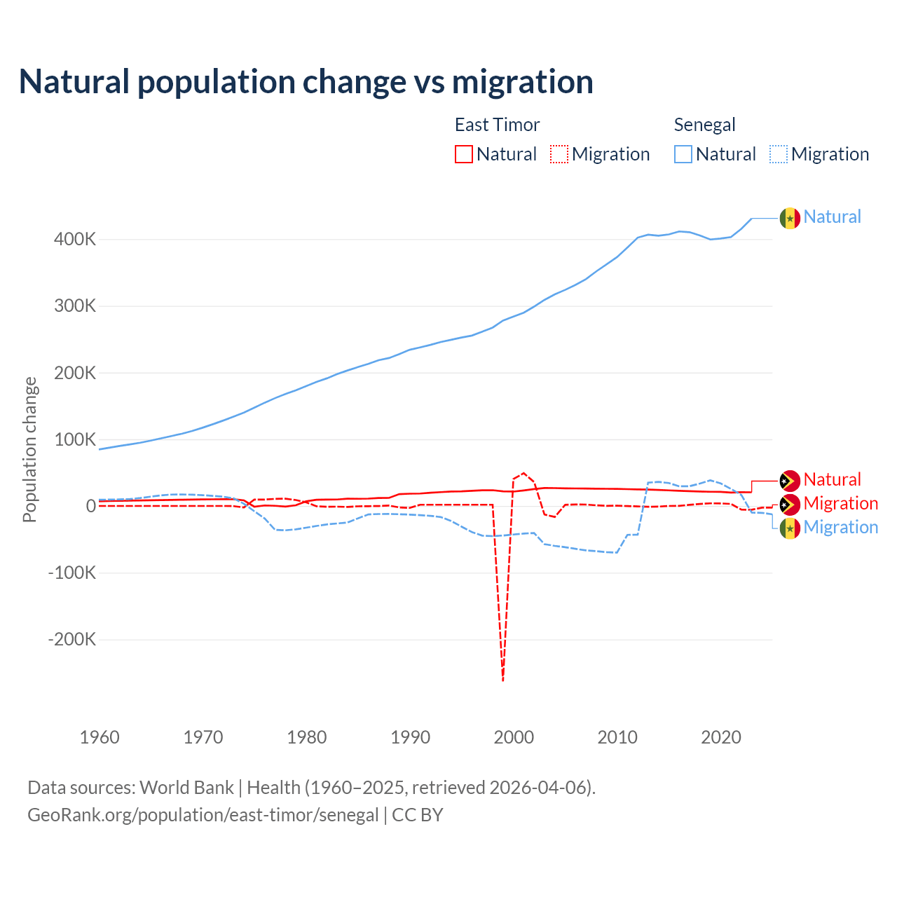 Over the last 10 years, 98.3% of the population change in East Timor is from natural causes (a gain of 217,698 people) and 1.66% is from migration (a gain of 3,665 people). In Senegal 93.9% is from natural causes (a gain of 4,089,205 people) and 6.13% is from migration (a gain of 267,266 people).