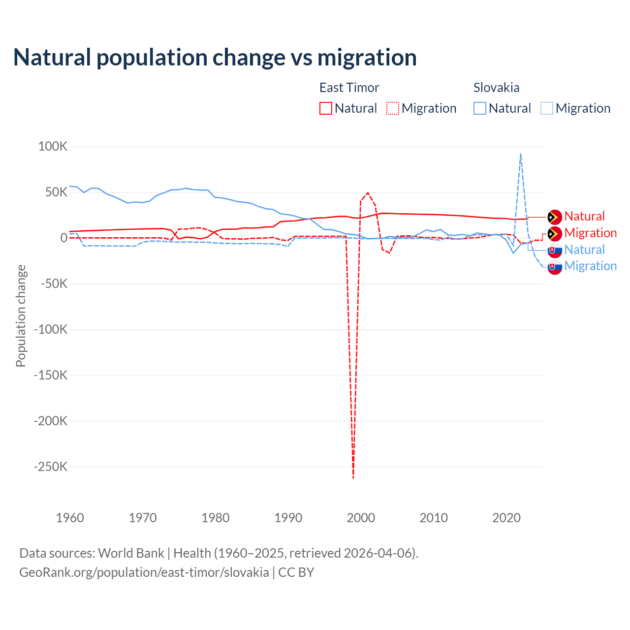 Over the last 10 years, 98.3% of the population change in East Timor is from natural causes (a gain of 217,698 people) and 1.66% is from migration (a gain of 3,665 people). In Slovakia 7.47% is from natural causes (a loss of 8,728 people) and 92.5% is from migration (a gain of 108,156 people).