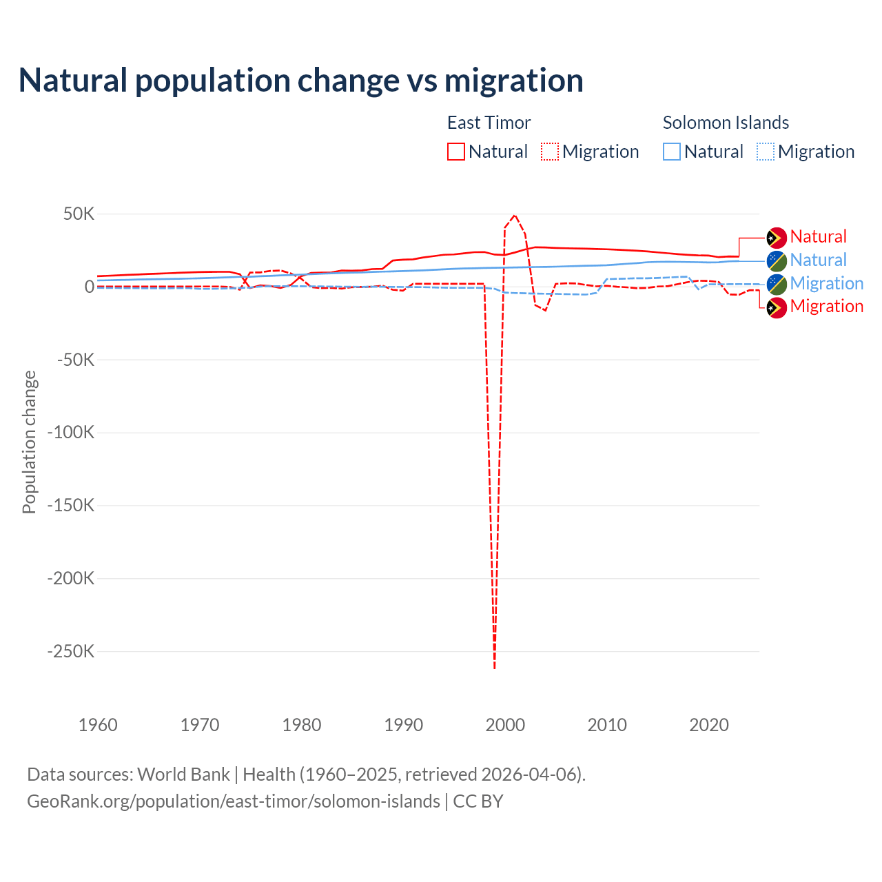 Over the last 10 years, 98.3% of the population change in East Timor is from natural causes (a gain of 217,698 people) and 1.66% is from migration (a gain of 3,665 people). In the Solomon Islands 82.8% is from natural causes (a gain of 168,727 people) and 17.2% is from migration (a gain of 35,031 people).