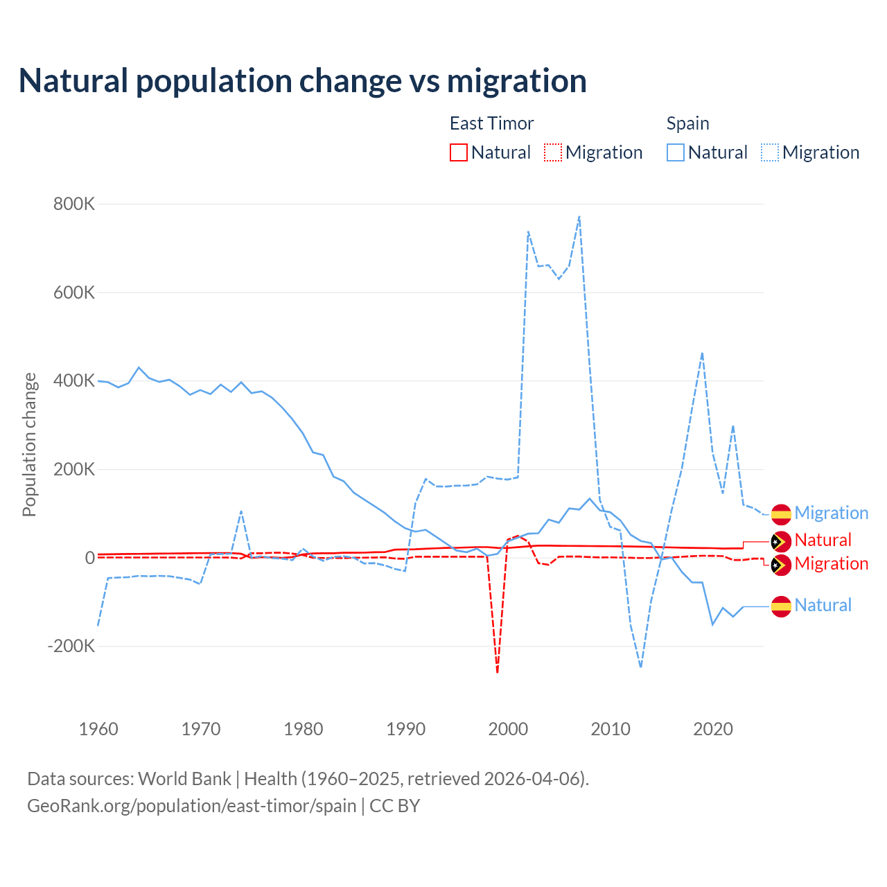 Over the last 10 years, 98.3% of the population change in East Timor is from natural causes (a gain of 217,698 people) and 1.66% is from migration (a gain of 3,665 people). In Spain 25.8% is from natural causes (a loss of 627,829 people) and 74.2% is from migration (a gain of 1,810,127 people).