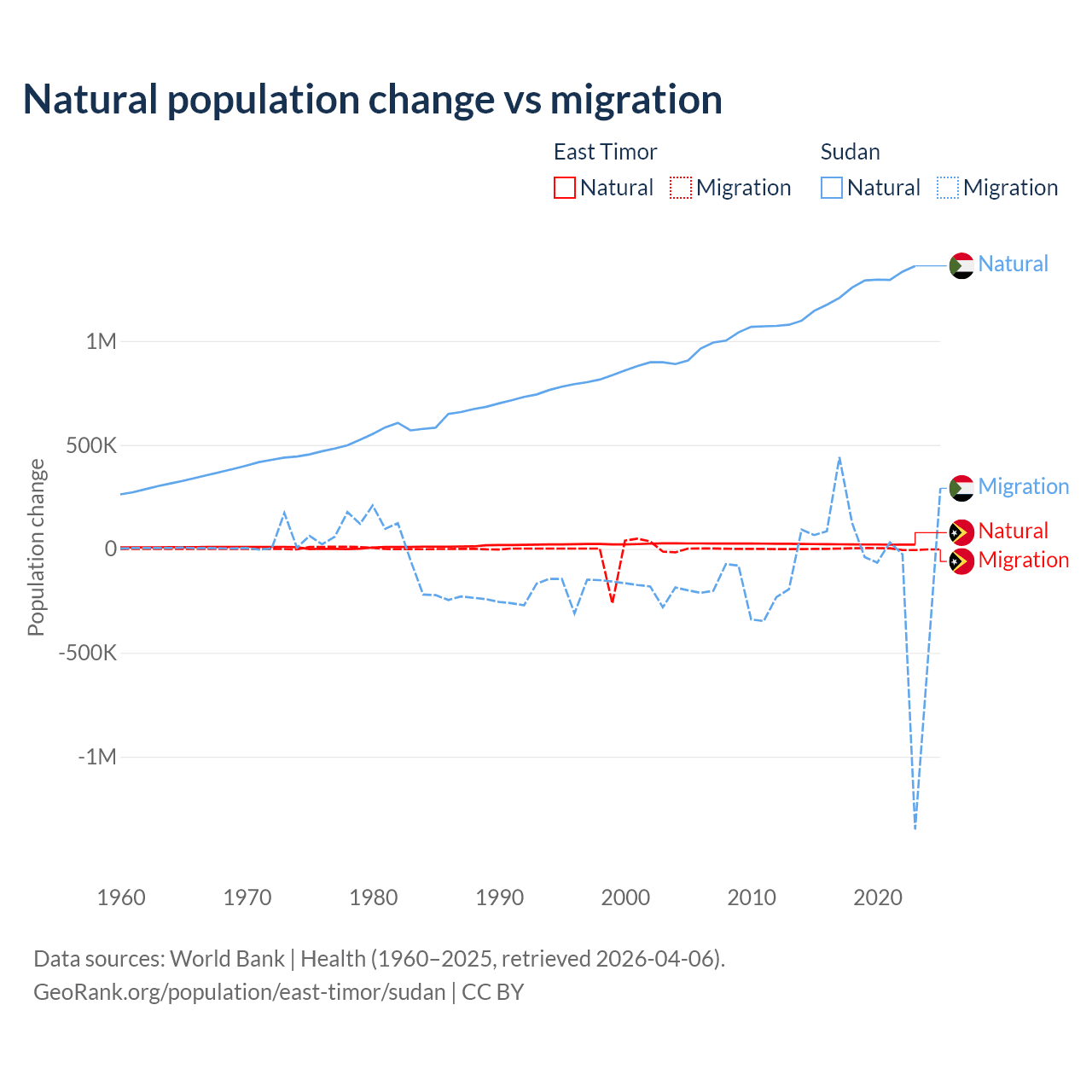 Over the last 10 years, 98.3% of the population change in East Timor is from natural causes (a gain of 217,698 people) and 1.66% is from migration (a gain of 3,665 people). In Sudan 95.1% is from natural causes (a gain of 12,459,977 people) and 4.88% is from migration (a loss of 639,596 people).