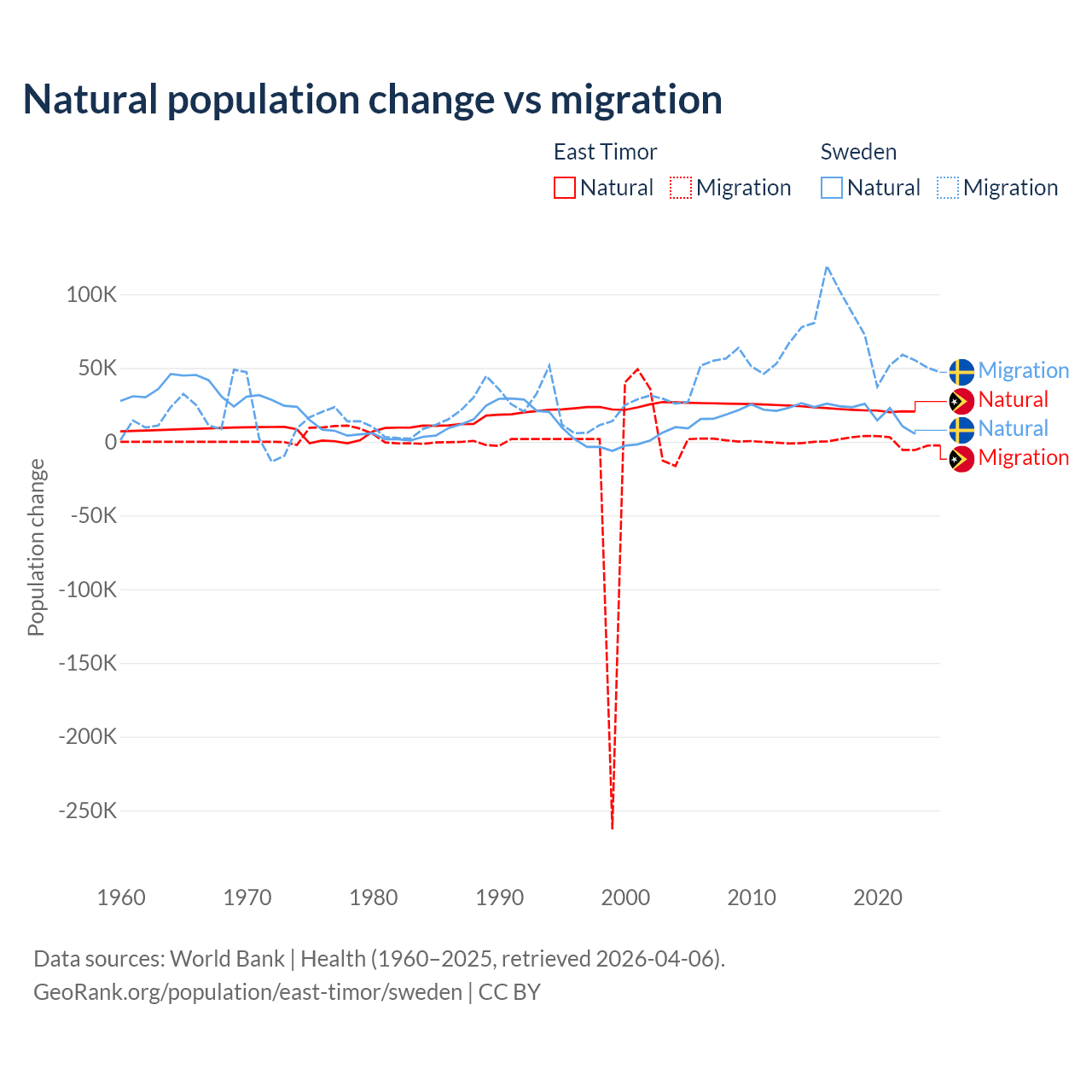 Over the last 10 years, 98.3% of the population change in East Timor is from natural causes (a gain of 217,698 people) and 1.66% is from migration (a gain of 3,665 people). In Sweden 21.4% is from natural causes (a gain of 201,900 people) and 78.6% is from migration (a gain of 743,642 people).