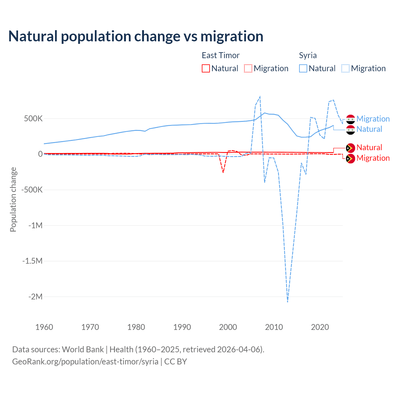 Over the last 10 years, 98.3% of the population change in East Timor is from natural causes (a gain of 217,698 people) and 1.66% is from migration (a gain of 3,665 people). In Syria 91.3% is from natural causes (a gain of 3,047,621 people) and 8.72% is from migration (a gain of 291,069 people).