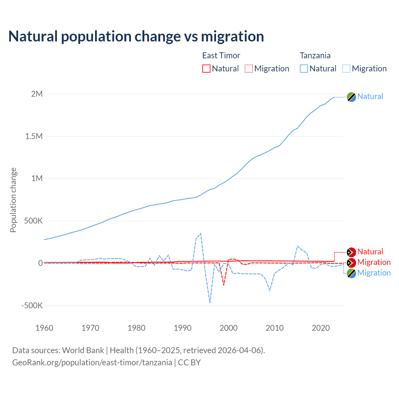 Over the last 10 years, 98.3% of the population change in East Timor is from natural causes (a gain of 217,698 people) and 1.66% is from migration (a gain of 3,665 people). In Tanzania 98.7% is from natural causes (a gain of 17,769,541 people) and 1.27% is from migration (a gain of 229,466 people).