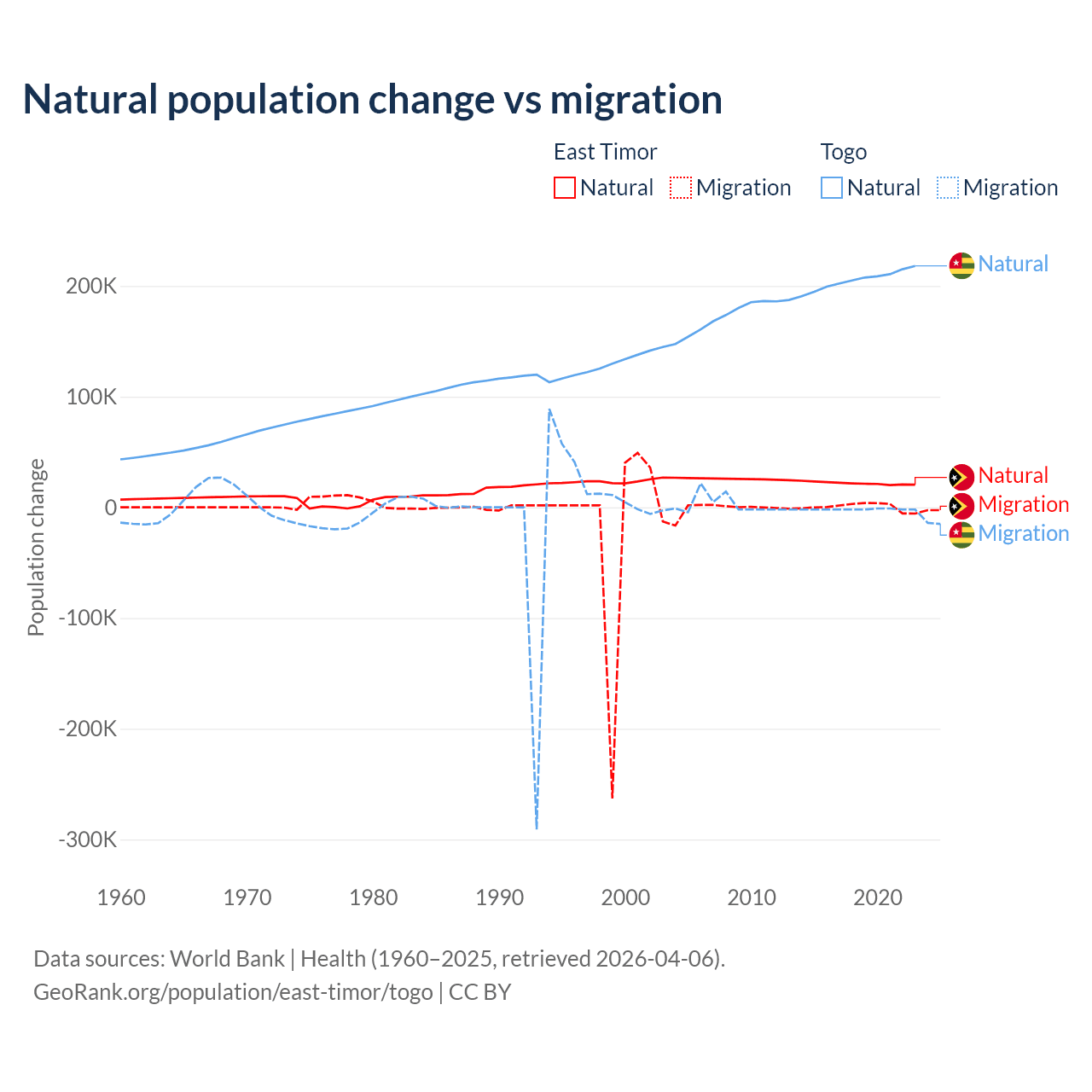 Over the last 10 years, 98.3% of the population change in East Timor is from natural causes (a gain of 217,698 people) and 1.66% is from migration (a gain of 3,665 people). In Togo 99.1% is from natural causes (a gain of 2,052,115 people) and 0.86% is from migration (a loss of 17,852 people).