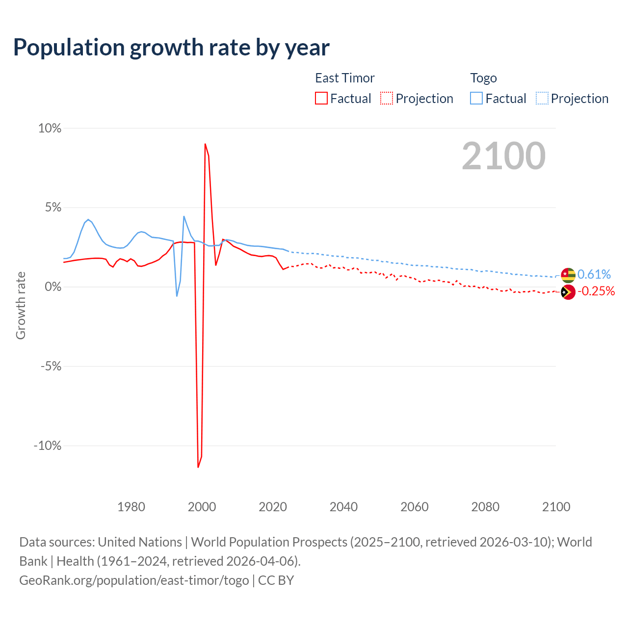 - For the last 10 years, East Timor has had an average growth rate of +1.74% per year vs +2.46% in Togo.