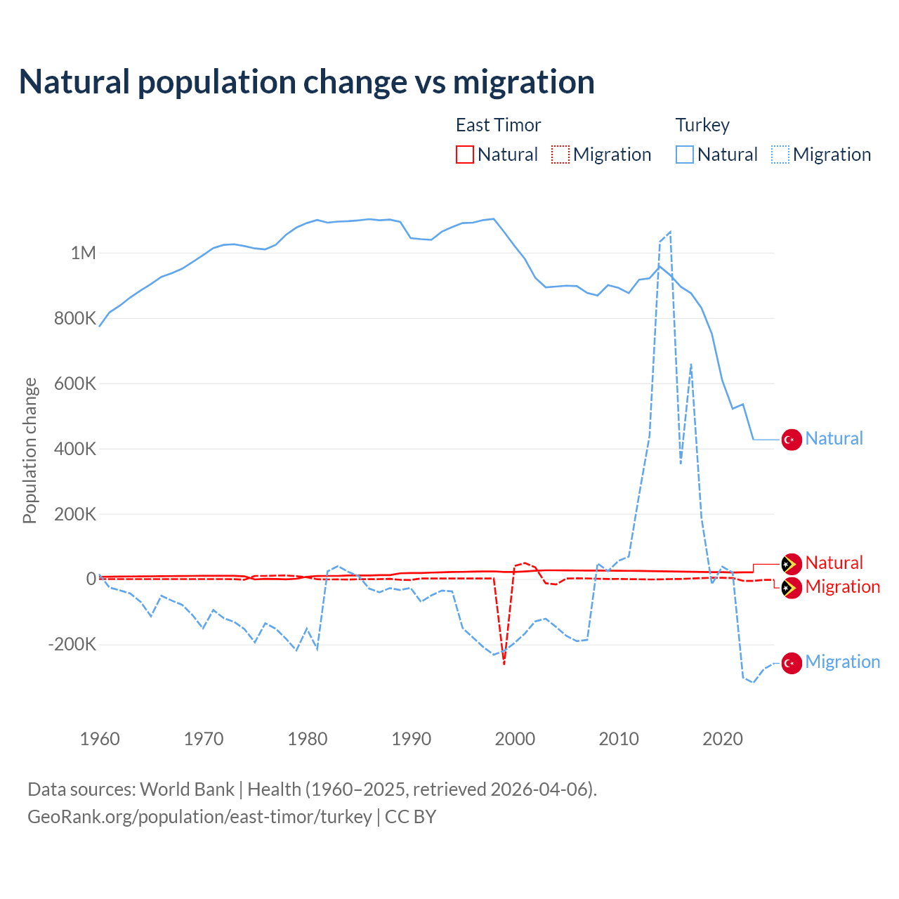 Over the last 10 years, 98.3% of the population change in East Timor is from natural causes (a gain of 217,698 people) and 1.66% is from migration (a gain of 3,665 people). In Turkey 73% is from natural causes (a gain of 7,333,352 people) and 27% is from migration (a gain of 2,718,916 people).