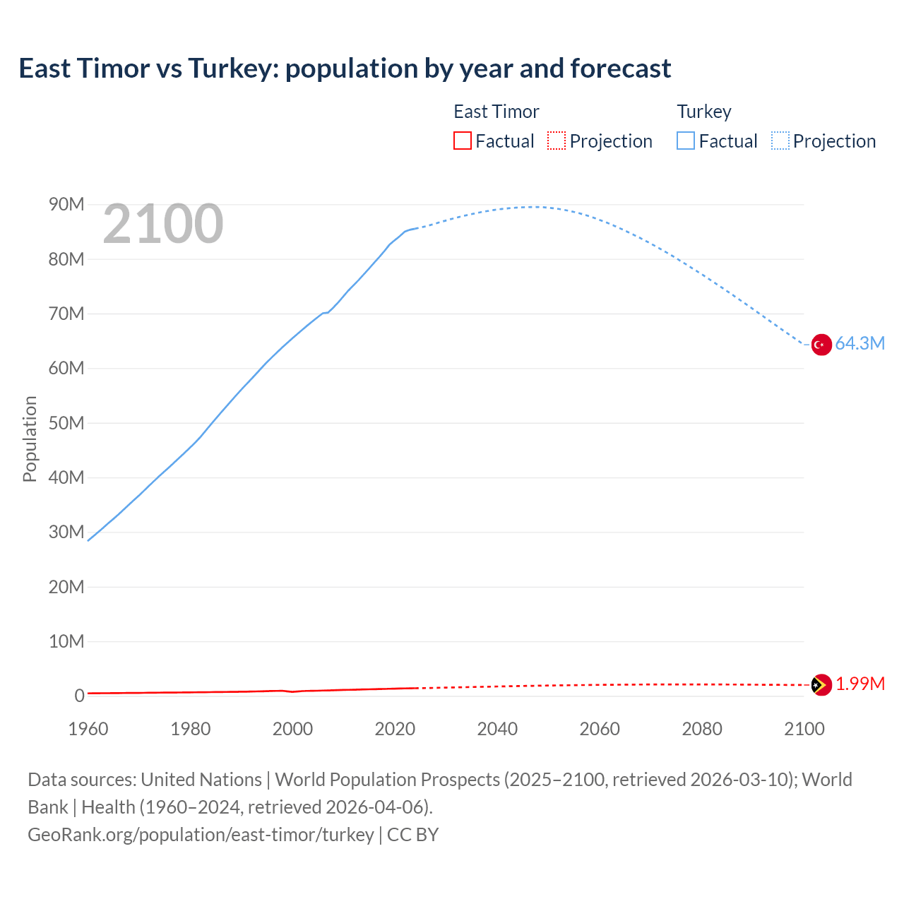 The latest officially reported population of East Timor was 1,400,638 in 2024 vs 85,518,661 people in Turkey in 2024. In 2026, based on the adjusted UN estimation, the current East Timor's population is 1,441,764 people compared to 86,002,379 in Turkey.