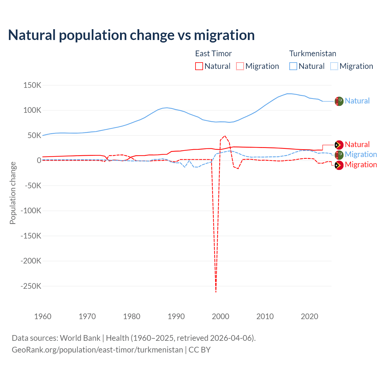 Over the last 10 years, 98.3% of the population change in East Timor is from natural causes (a gain of 217,698 people) and 1.66% is from migration (a gain of 3,665 people). In Turkmenistan 89.2% is from natural causes (a gain of 1,270,228 people) and 10.8% is from migration (a gain of 154,379 people).