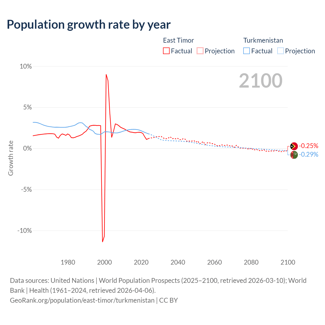 - For the last 10 years, East Timor has had an average growth rate of +1.74% per year vs +2.14% in Turkmenistan.