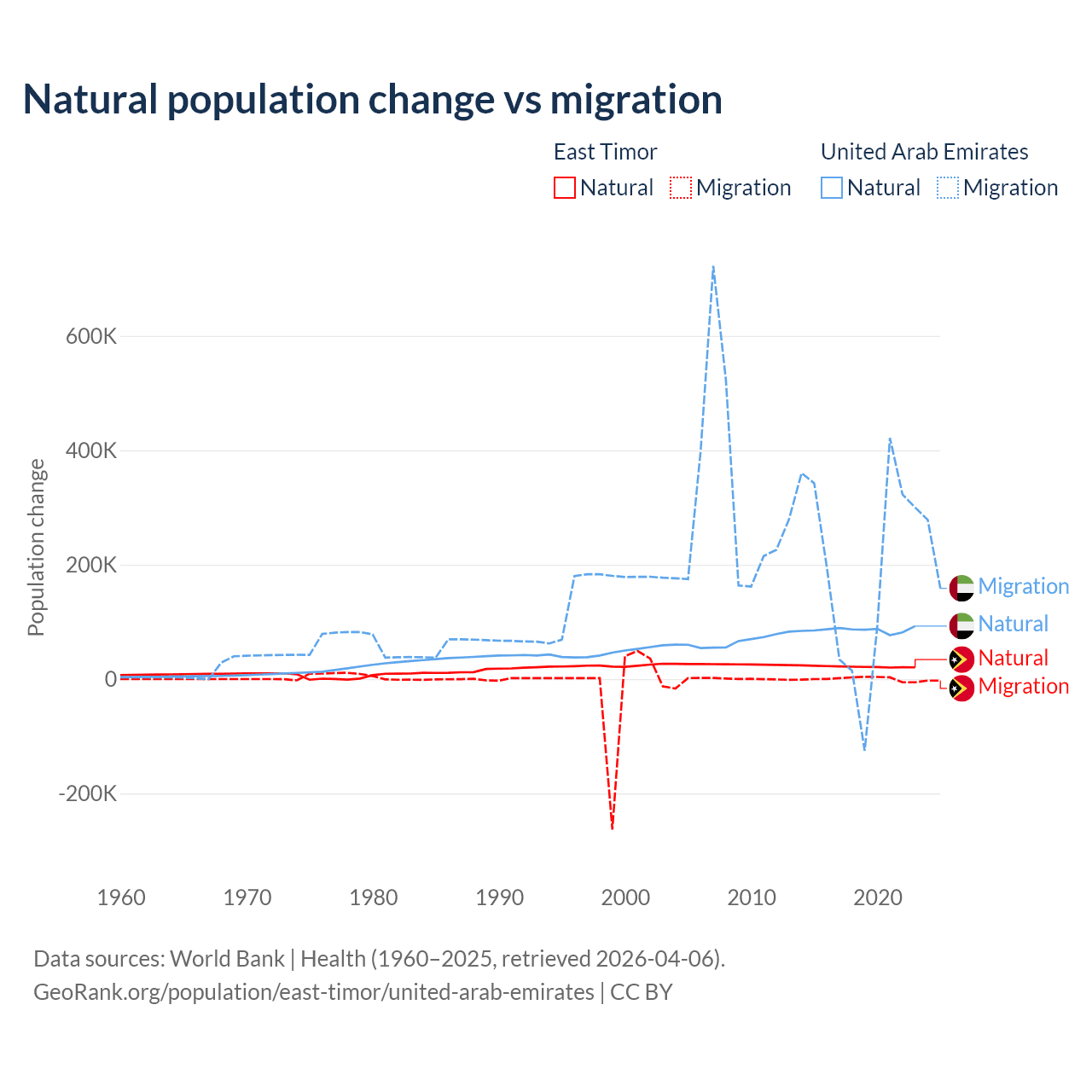 Over the last 10 years, 98.3% of the population change in East Timor is from natural causes (a gain of 217,698 people) and 1.66% is from migration (a gain of 3,665 people). In the United Arab Emirates 30.5% is from natural causes (a gain of 857,996 people) and 69.5% is from migration (a gain of 1,958,520 people).