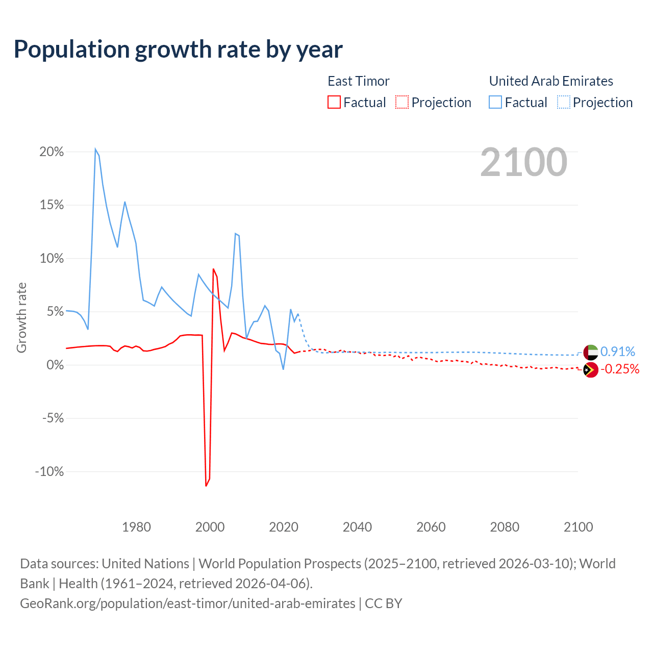 - For the last 10 years, East Timor has had an average growth rate of +1.74% per year vs +3.31% in the United Arab Emirates.