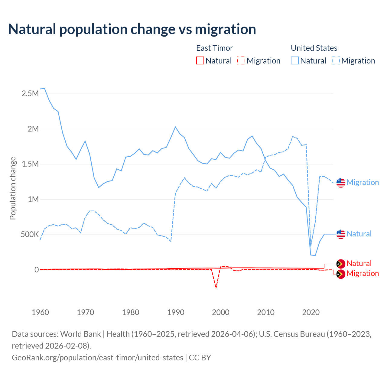 Over the last 10 years, 98.3% of the population change in East Timor is from natural causes (a gain of 217,698 people) and 1.66% is from migration (a gain of 3,665 people). In the United States 35.8% is from natural causes (a gain of 8,005,866 people) and 64.2% is from migration (a gain of 14,334,286 people).
