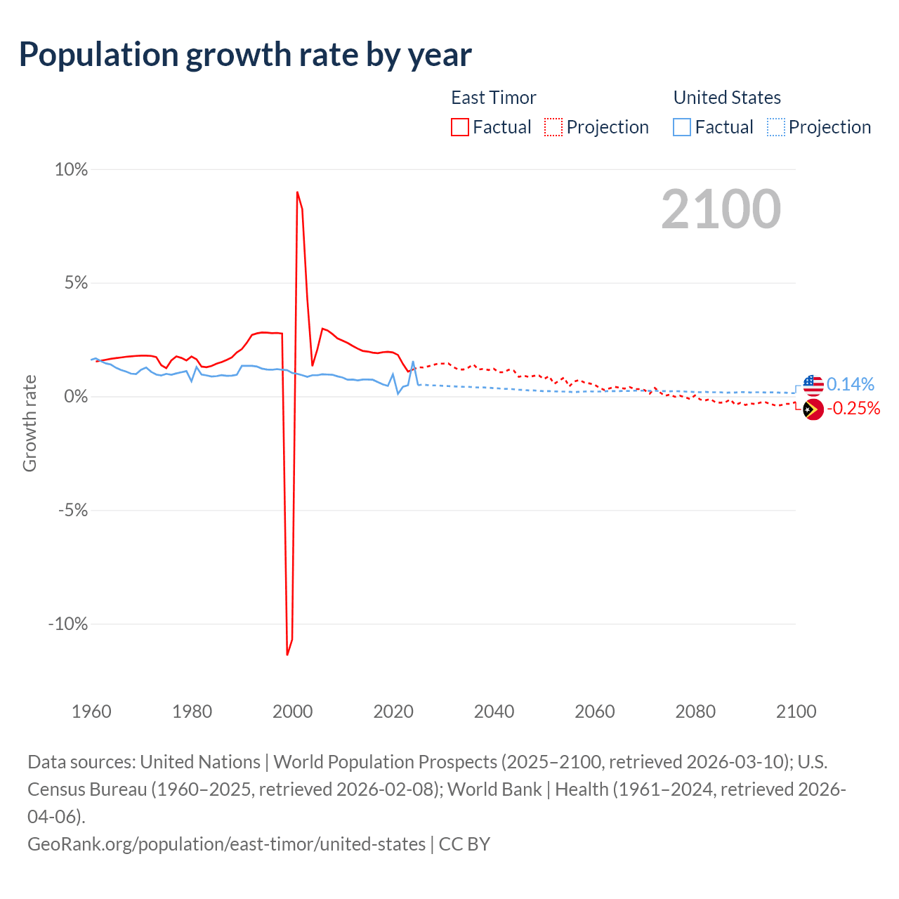 - For the last 10 years, East Timor has had an average growth rate of +1.74% per year vs +0.65% in the United States.