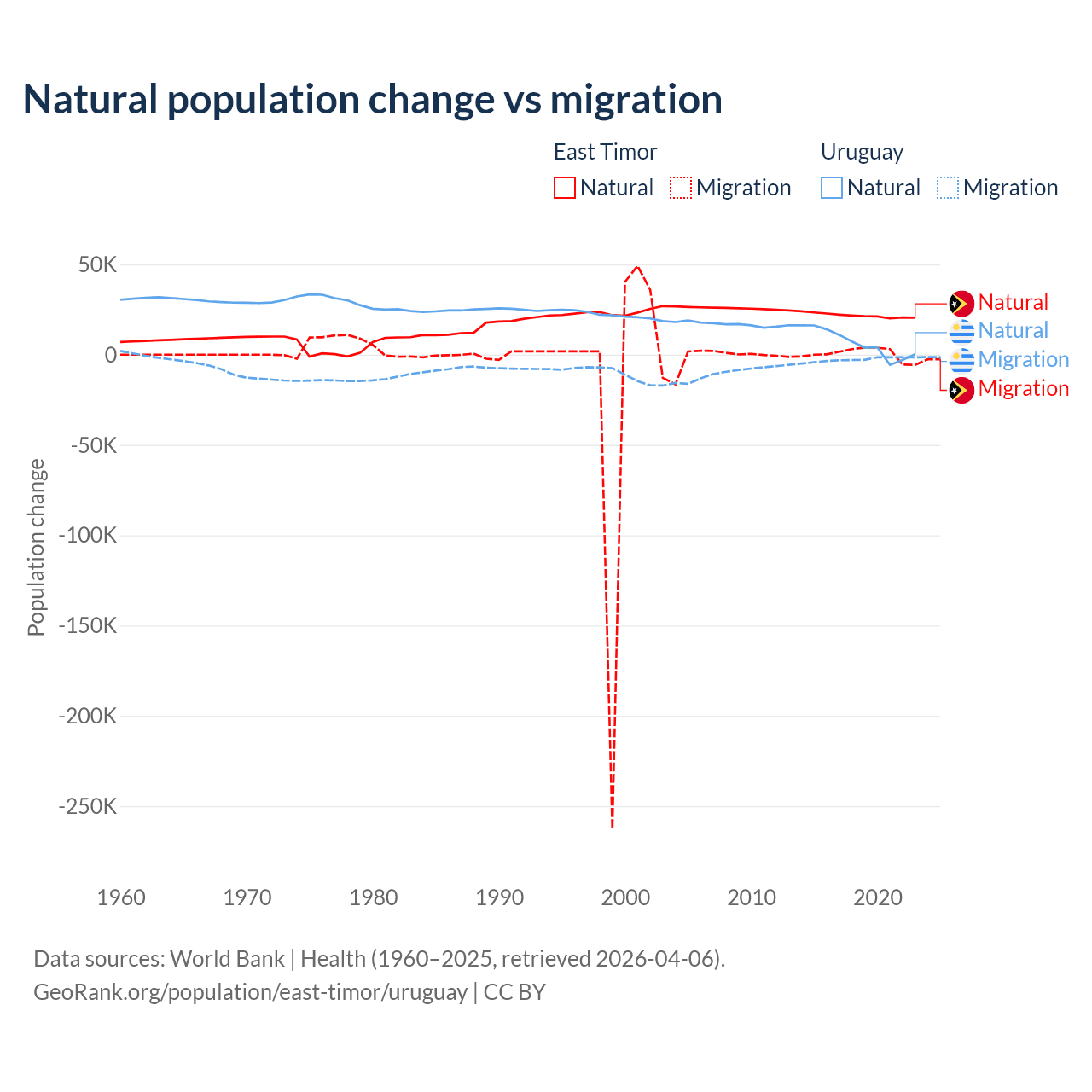 Over the last 10 years, 98.3% of the population change in East Timor is from natural causes (a gain of 217,698 people) and 1.66% is from migration (a gain of 3,665 people). In Uruguay 70% is from natural causes (a gain of 64,303 people) and 30% is from migration (a loss of 27,501 people).