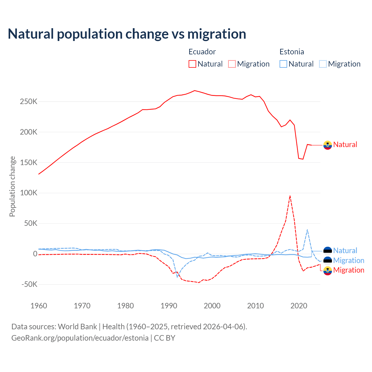 Over the last 10 years, 91.9% of the population change in Ecuador is from natural causes (a gain of 1,964,352 people) and 8.08% is from migration (a gain of 172,707 people). In Estonia 26.1% is from natural causes (a loss of 27,683 people) and 73.9% is from migration (a gain of 78,553 people).