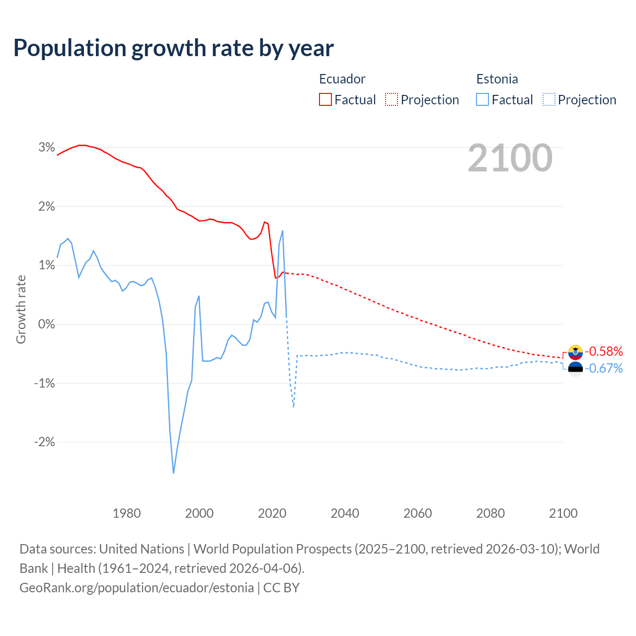 - For the last 10 years, Ecuador has had an average growth rate of +1.26% per year vs +0.37% in Estonia.