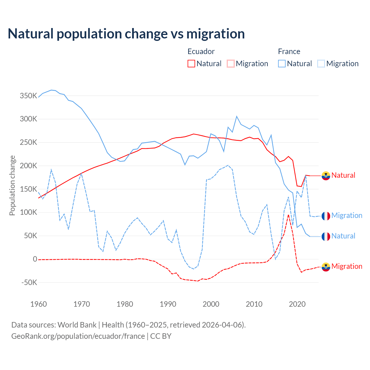 Over the last 10 years, 91.9% of the population change in Ecuador is from natural causes (a gain of 1,964,352 people) and 8.08% is from migration (a gain of 172,707 people). In France 59.5% is from natural causes (a gain of 1,359,540 people) and 40.5% is from migration (a gain of 923,723 people).