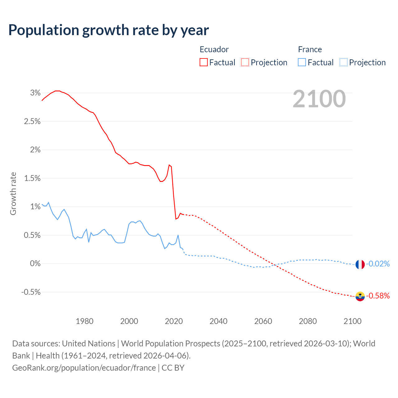 - For the last 10 years, Ecuador has had an average growth rate of +1.26% per year vs +0.35% in France.