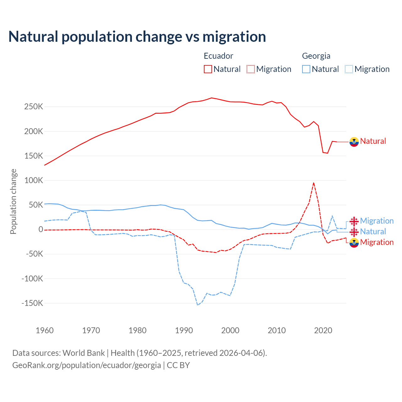 Over the last 10 years, 91.9% of the population change in Ecuador is from natural causes (a gain of 1,964,352 people) and 8.08% is from migration (a gain of 172,707 people). In Georgia 57.7% is from natural causes (a gain of 47,646 people) and 42.3% is from migration (a loss of 34,907 people).