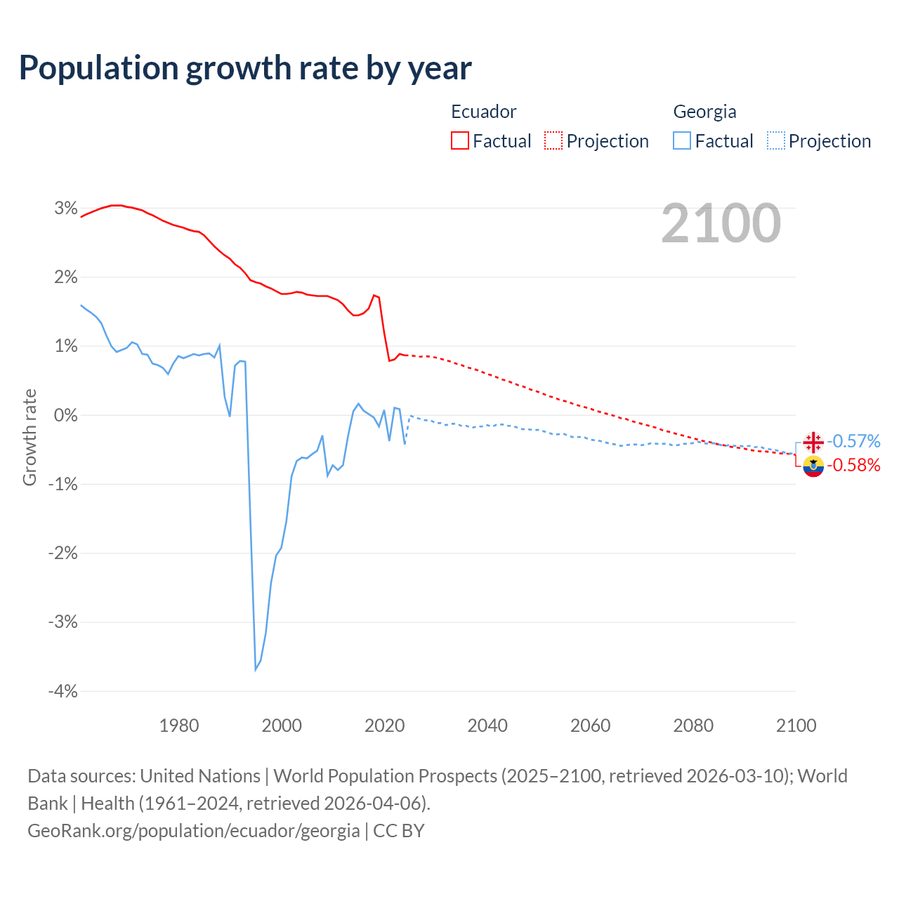 - For the last 10 years, Ecuador has had an average growth rate of +1.26% per year vs -0.04% in Georgia.