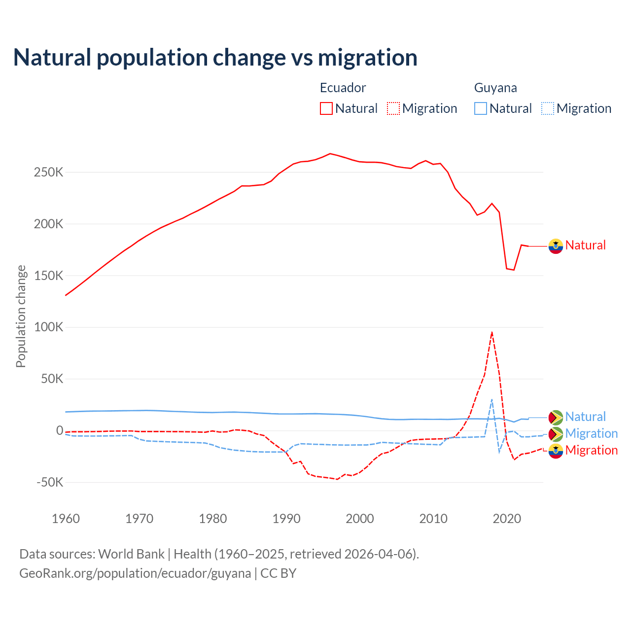 Over the last 10 years, 91.9% of the population change in Ecuador is from natural causes (a gain of 1,964,352 people) and 8.08% is from migration (a gain of 172,707 people). In Guyana 77.7% is from natural causes (a gain of 107,419 people) and 22.3% is from migration (a loss of 30,797 people).