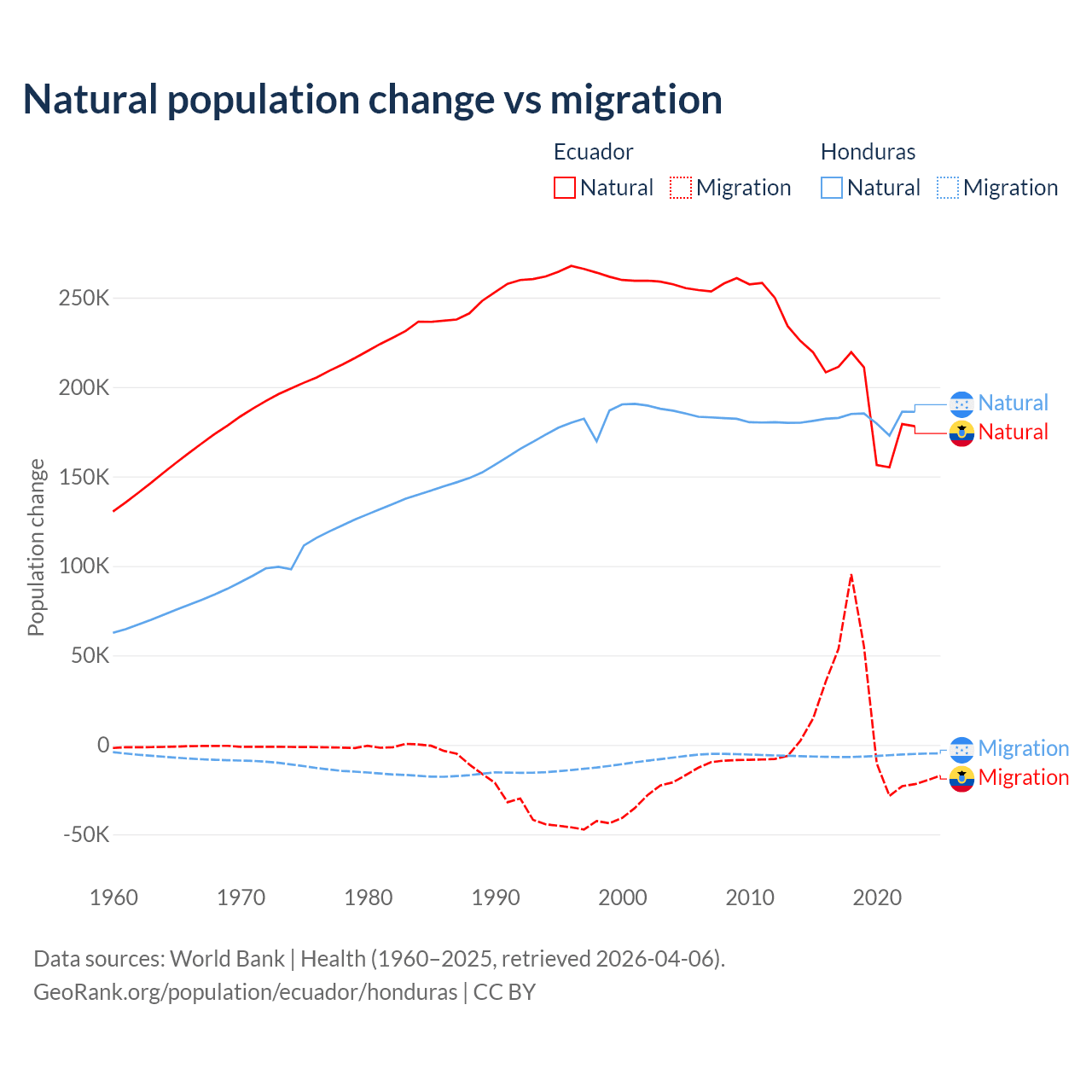 Over the last 10 years, 91.9% of the population change in Ecuador is from natural causes (a gain of 1,964,352 people) and 8.08% is from migration (a gain of 172,707 people). In Honduras 96.7% is from natural causes (a gain of 1,821,125 people) and 3.29% is from migration (a loss of 61,965 people).