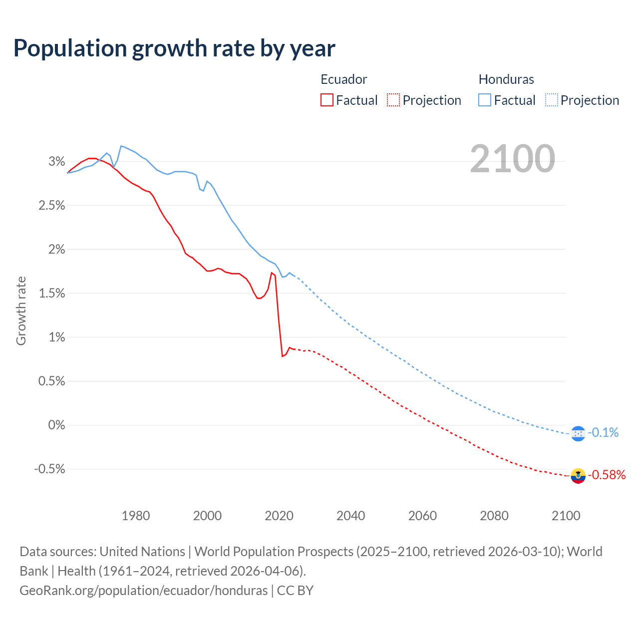 - For the last 10 years, Ecuador has had an average growth rate of +1.26% per year vs +1.81% in Honduras.