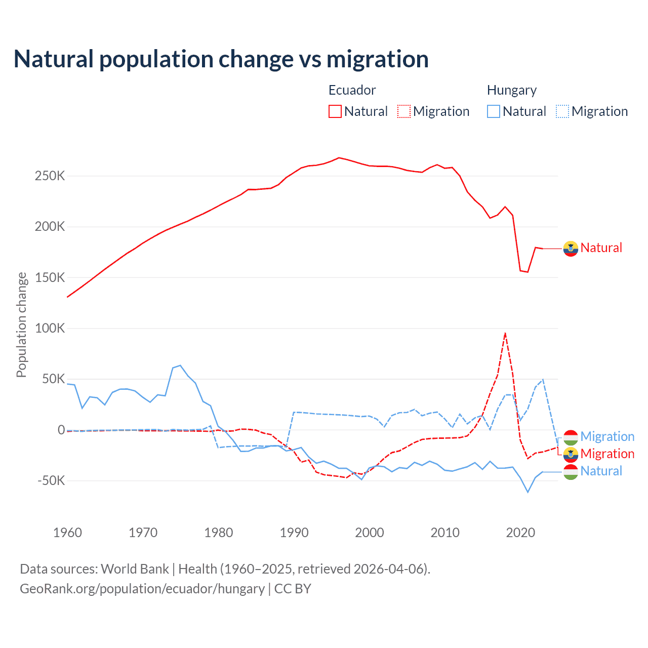 Over the last 10 years, 91.9% of the population change in Ecuador is from natural causes (a gain of 1,964,352 people) and 8.08% is from migration (a gain of 172,707 people). In Hungary 63.7% is from natural causes (a loss of 412,838 people) and 36.3% is from migration (a gain of 234,837 people).