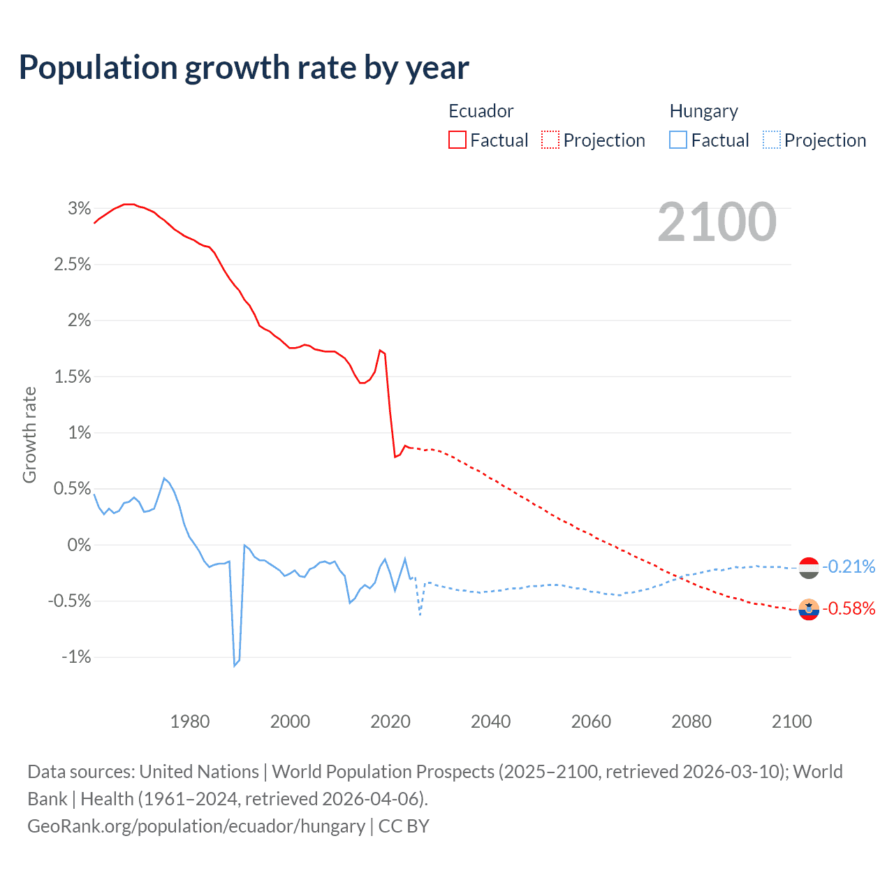 - For the last 10 years, Ecuador has had an average growth rate of +1.26% per year vs -0.29% in Hungary.