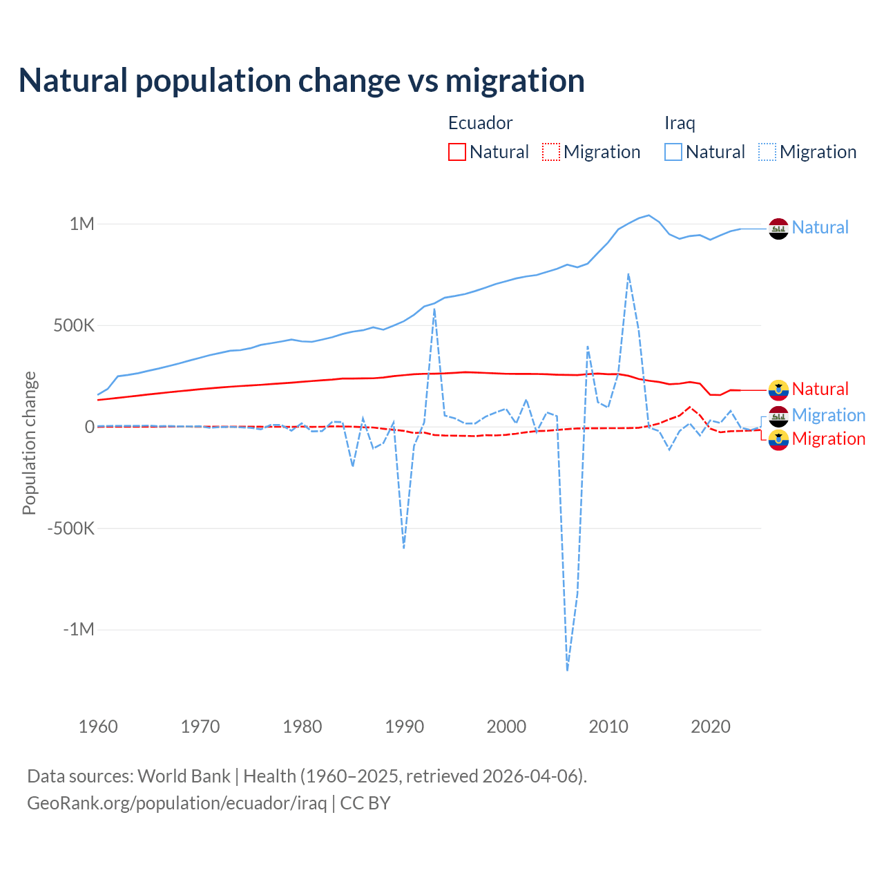Over the last 10 years, 91.9% of the population change in Ecuador is from natural causes (a gain of 1,964,352 people) and 8.08% is from migration (a gain of 172,707 people). In Iraq 99.2% is from natural causes (a gain of 9,598,842 people) and 0.76% is from migration (a loss of 73,050 people).