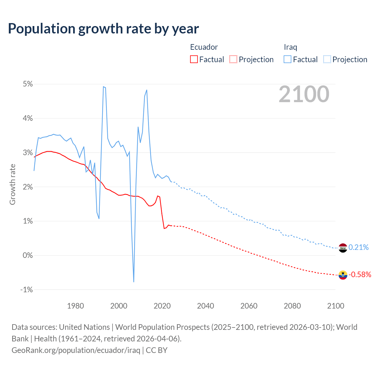 - For the last 10 years, Ecuador has had an average growth rate of +1.26% per year vs +2.45% in Iraq.