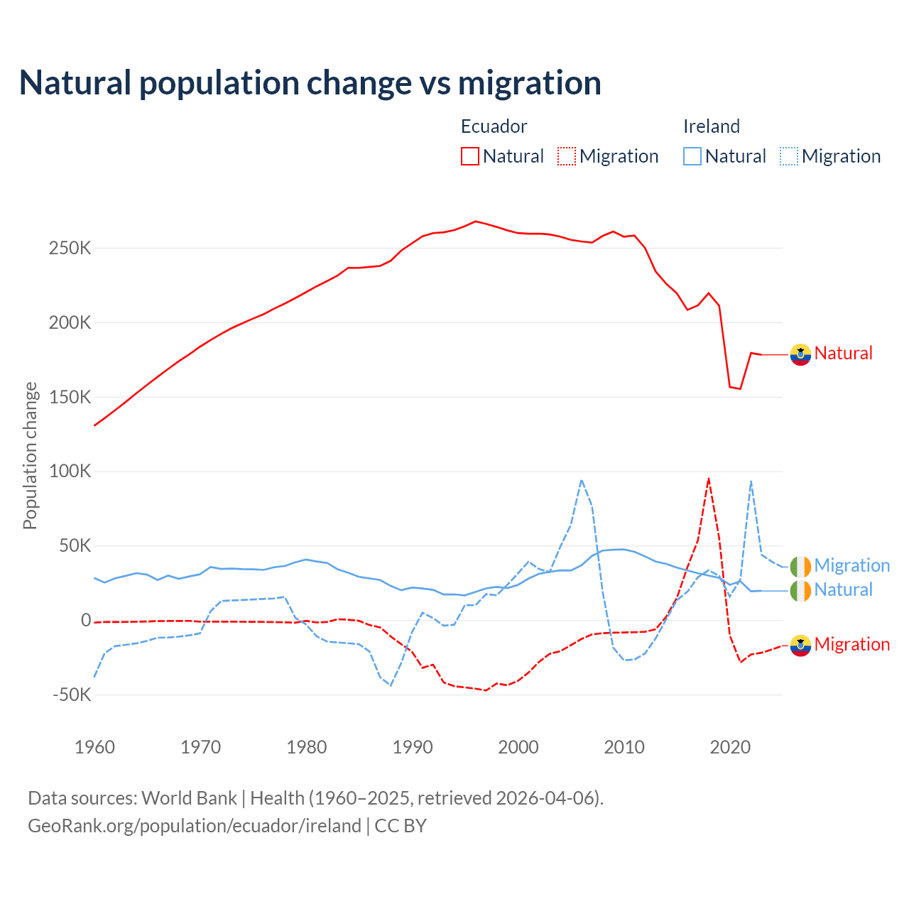 Over the last 10 years, 91.9% of the population change in Ecuador is from natural causes (a gain of 1,964,352 people) and 8.08% is from migration (a gain of 172,707 people). In Ireland 48.2% is from natural causes (a gain of 284,644 people) and 51.8% is from migration (a gain of 305,297 people).
