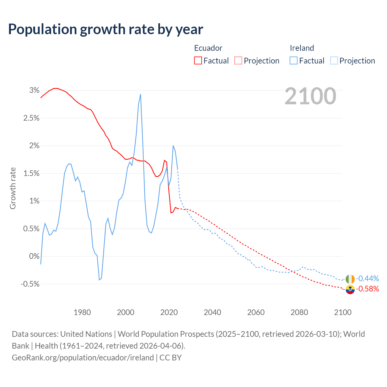 - For the last 10 years, Ecuador has had an average growth rate of +1.26% per year vs +1.41% in Ireland.