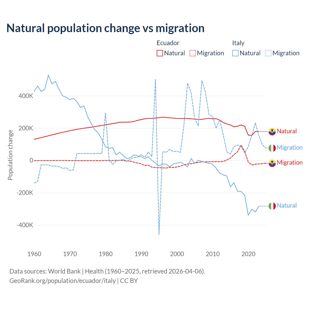 Over the last 10 years, 91.9% of the population change in Ecuador is from natural causes (a gain of 1,964,352 people) and 8.08% is from migration (a gain of 172,707 people). In Italy 68.6% is from natural causes (a loss of 2,239,084 people) and 31.4% is from migration (a gain of 1,026,128 people).