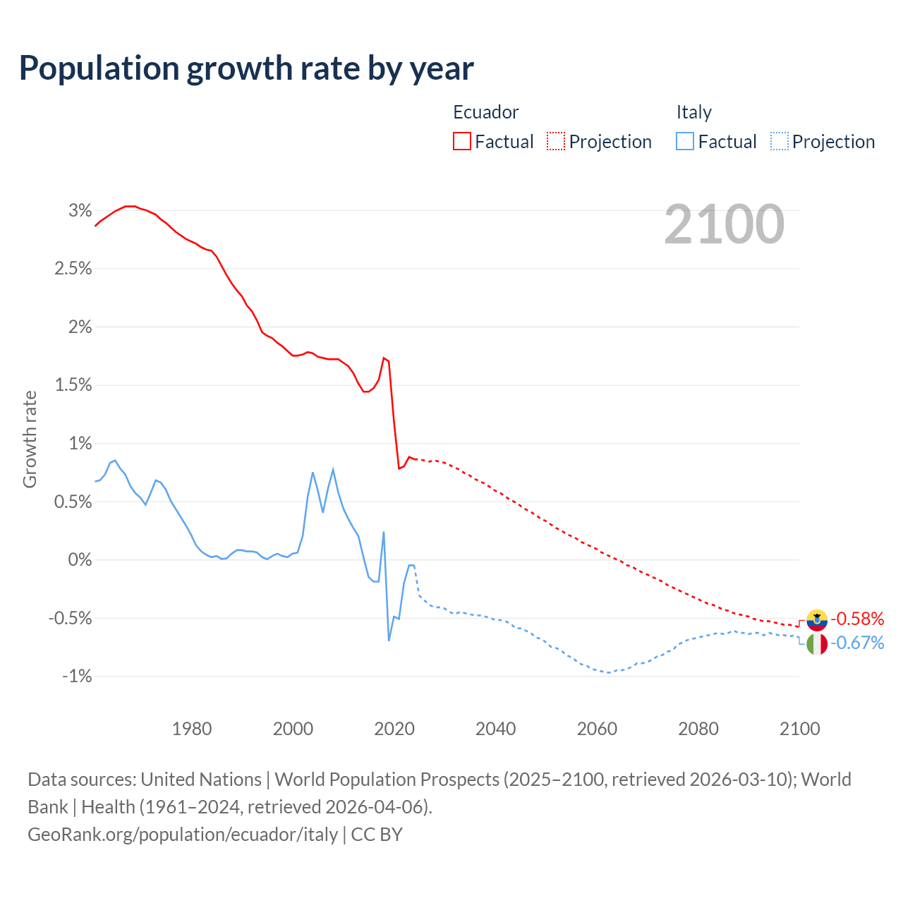 - For the last 10 years, Ecuador has had an average growth rate of +1.26% per year vs -0.21% in Italy.