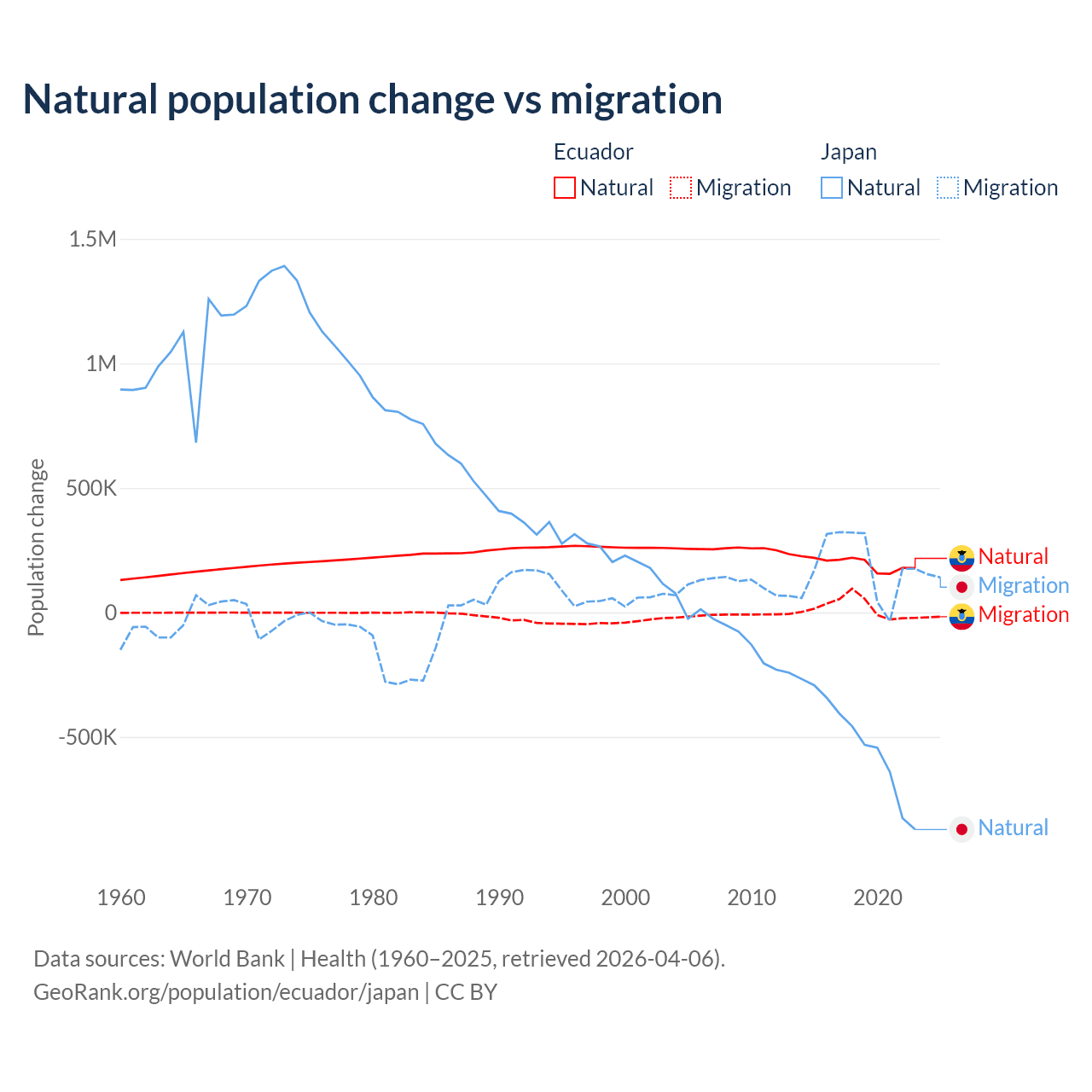 Over the last 10 years, 91.9% of the population change in Ecuador is from natural causes (a gain of 1,964,352 people) and 8.08% is from migration (a gain of 172,707 people). In Japan 73.6% is from natural causes (a loss of 5,178,838 people) and 26.4% is from migration (a gain of 1,860,103 people).