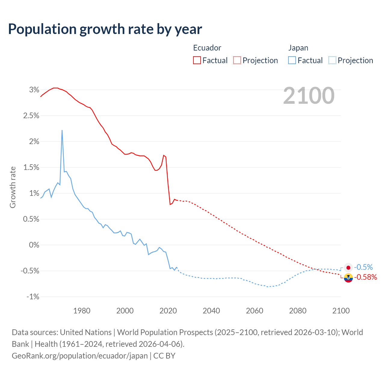 - For the last 10 years, Ecuador has had an average growth rate of +1.26% per year vs -0.25% in Japan.
