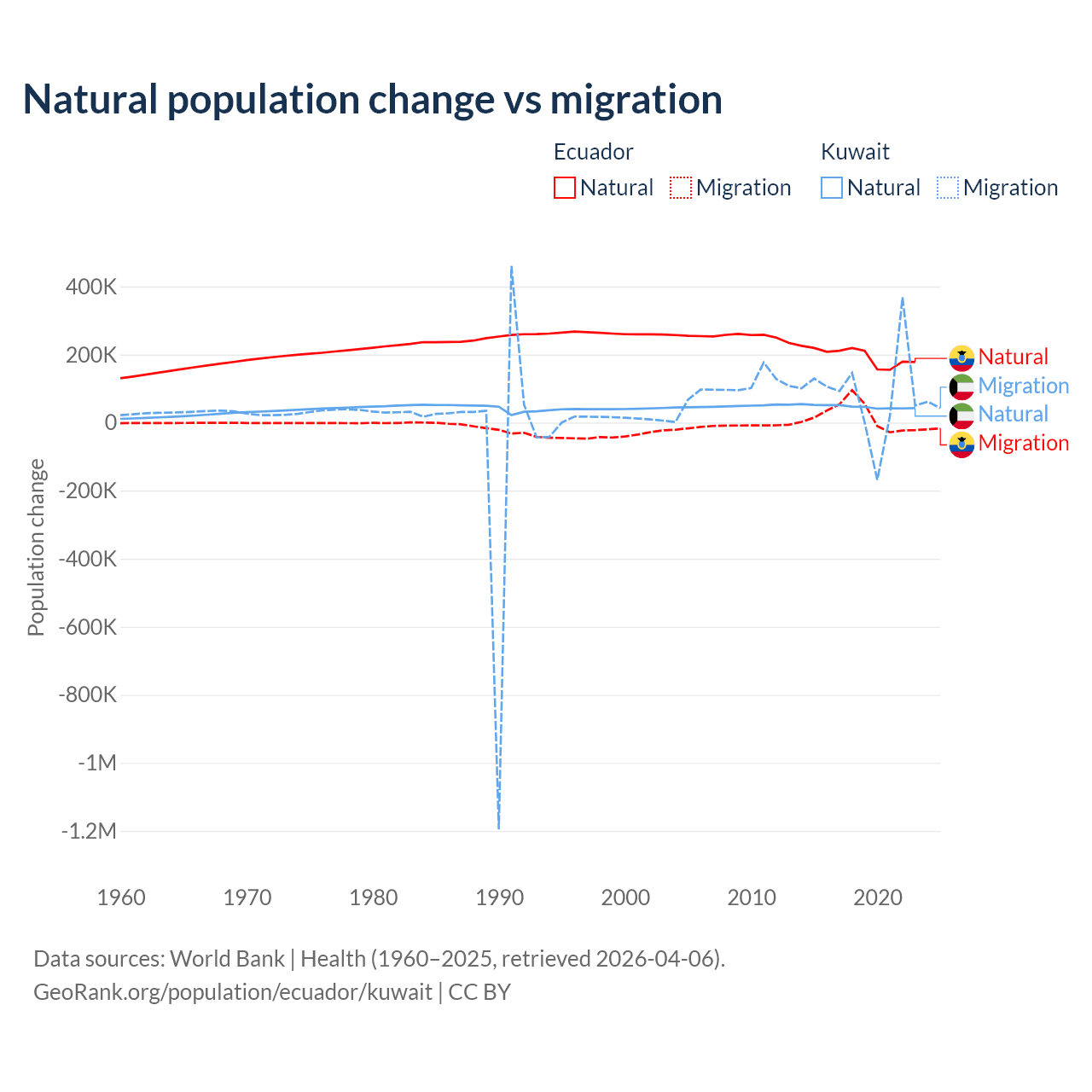 Over the last 10 years, 91.9% of the population change in Ecuador is from natural causes (a gain of 1,964,352 people) and 8.08% is from migration (a gain of 172,707 people). In Kuwait 35.8% is from natural causes (a gain of 470,645 people) and 64.2% is from migration (a gain of 845,142 people).