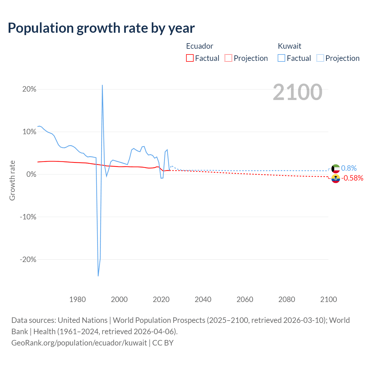 - For the last 10 years, Ecuador has had an average growth rate of +1.26% per year vs +3.1% in Kuwait.