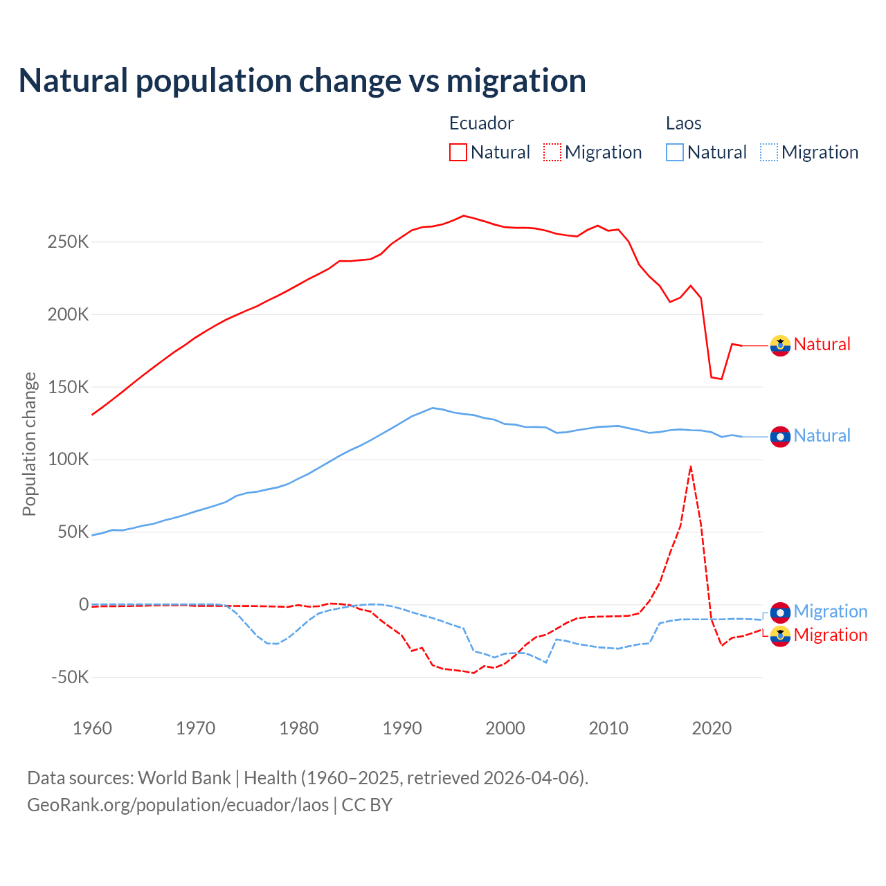 Over the last 10 years, 91.9% of the population change in Ecuador is from natural causes (a gain of 1,964,352 people) and 8.08% is from migration (a gain of 172,707 people). In Laos 90.6% is from natural causes (a gain of 1,183,013 people) and 9.41% is from migration (a loss of 122,899 people).