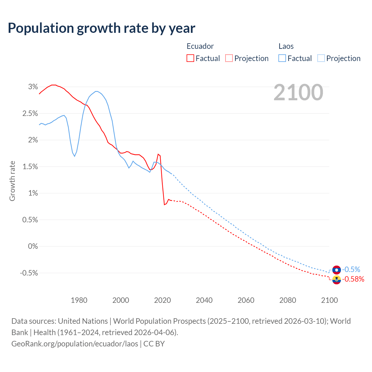 - For the last 10 years, Ecuador has had an average growth rate of +1.26% per year vs +1.48% in Laos.