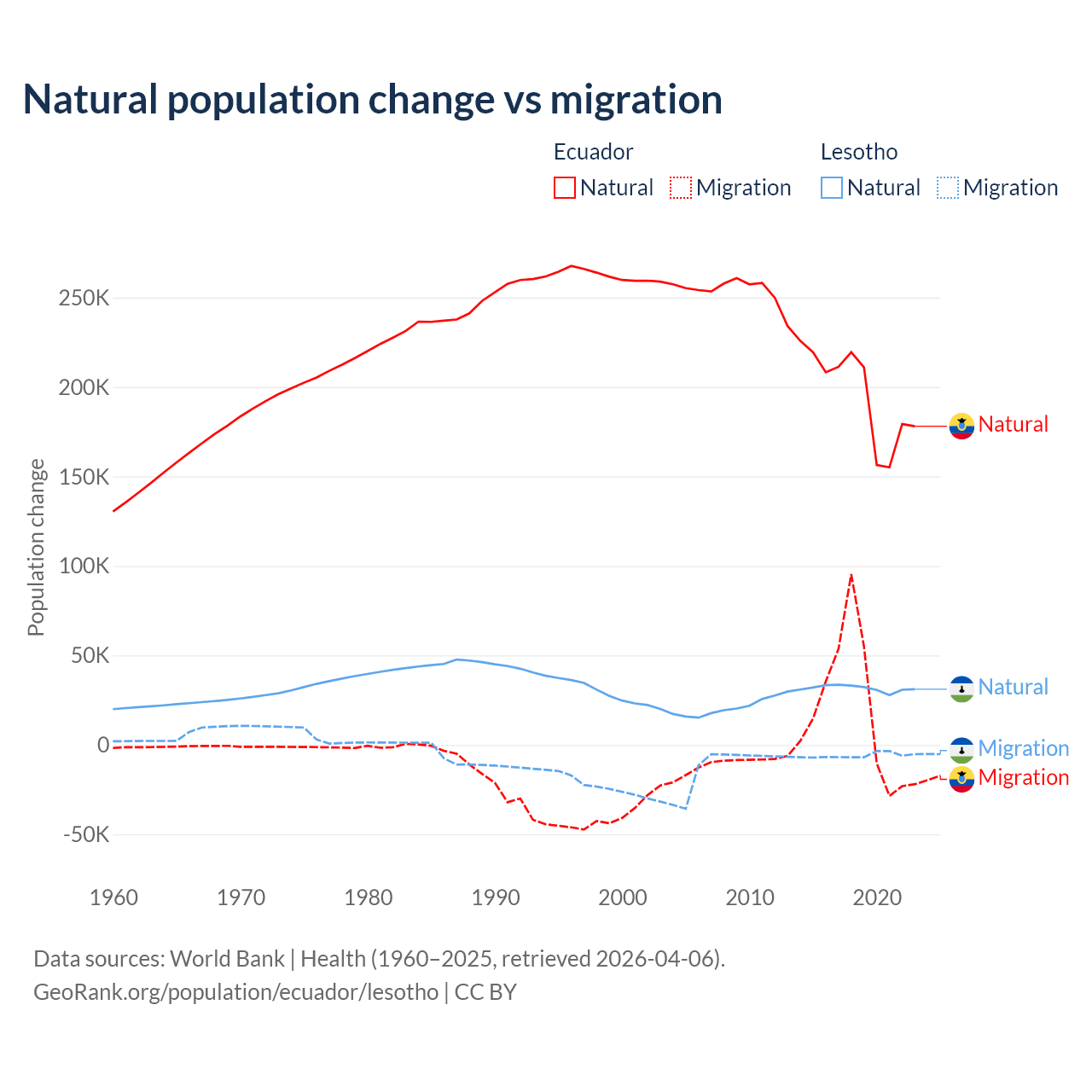 Over the last 10 years, 91.9% of the population change in Ecuador is from natural causes (a gain of 1,964,352 people) and 8.08% is from migration (a gain of 172,707 people). In Lesotho 84.2% is from natural causes (a gain of 315,836 people) and 15.8% is from migration (a loss of 59,457 people).