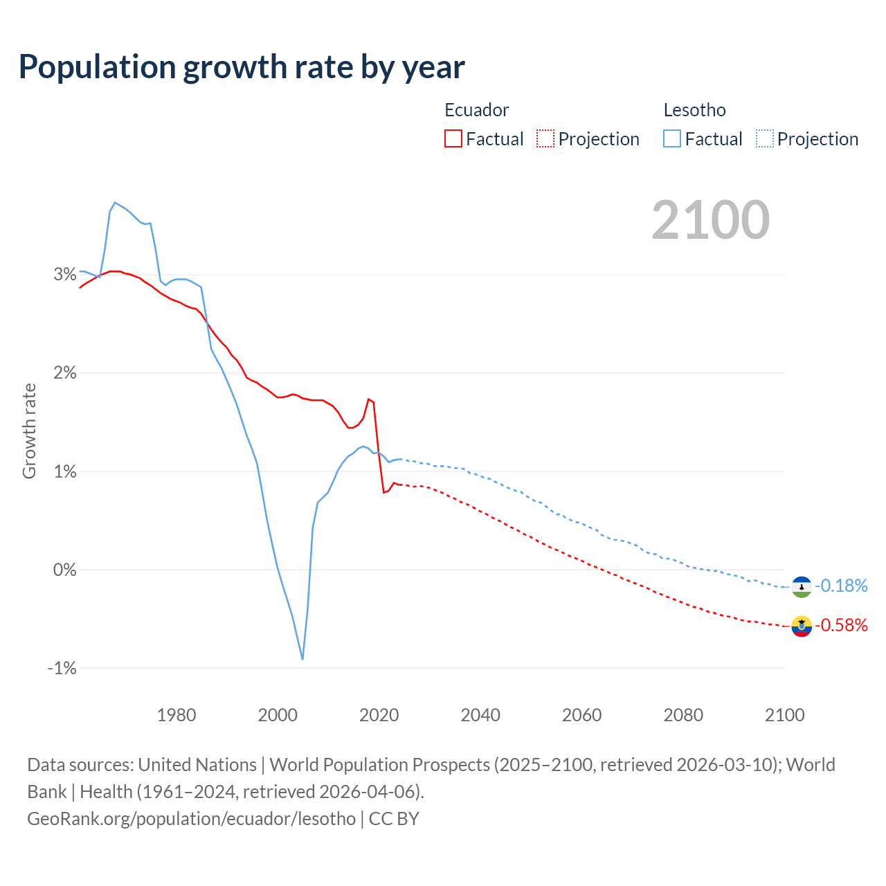 - For the last 10 years, Ecuador has had an average growth rate of +1.26% per year vs +1.17% in Lesotho.