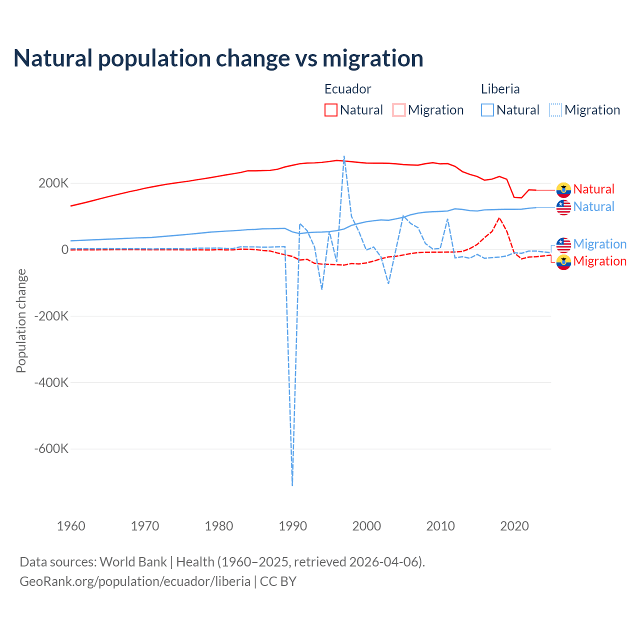 Over the last 10 years, 91.9% of the population change in Ecuador is from natural causes (a gain of 1,964,352 people) and 8.08% is from migration (a gain of 172,707 people). In Liberia 87.7% is from natural causes (a gain of 1,202,387 people) and 12.3% is from migration (a loss of 168,316 people).